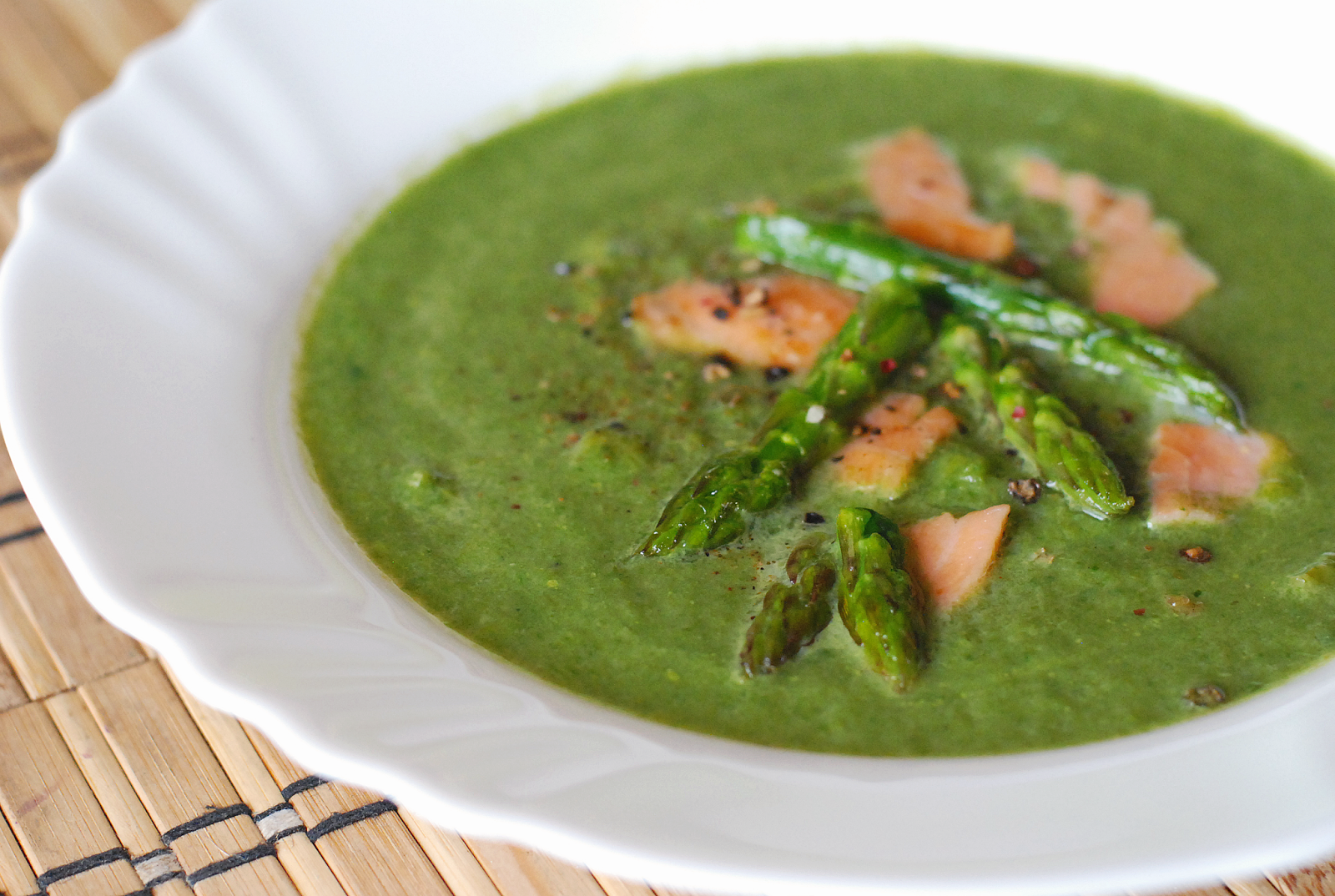 Na polévku budete potřebovat: 300g zeleného chřestu, čerstvý špenát, 3 stroužky česneku, 1 bílou cibuli, zeleninový vývar, 100g uzeného lososa, olivový olej, 1 lžíci másla, sůl a pepř.
